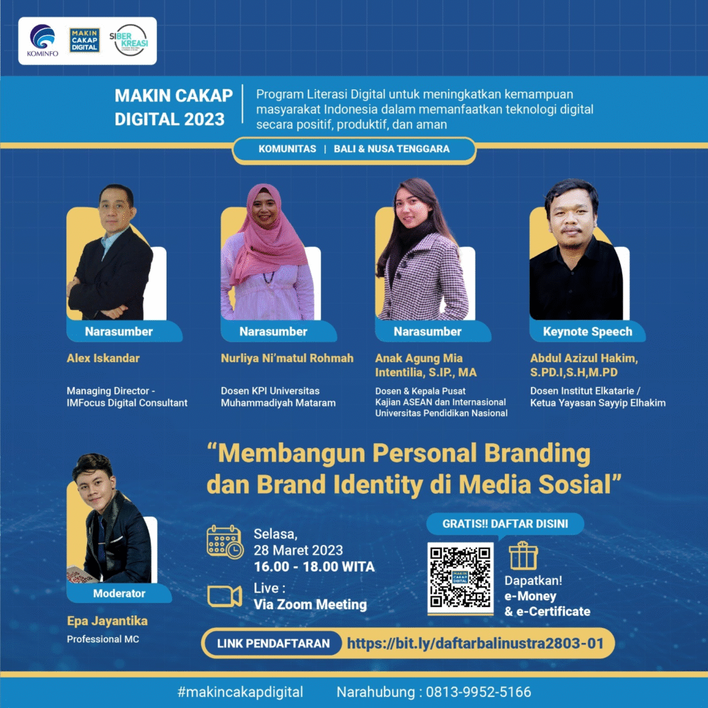Acara yang berlangsung secara daring melalui Zoom Meeting pada hari Selasa, 28 Maret 2023, pukul 16.00 – 18.00 WITA ini, menghadirkan berbagai narasumber profesional, baik dari kalangan praktisi digital maupun akademisi. Kehadiran Abdul Azizul Hakim sebagai keynote speaker menegaskan peran penting dosen PGMI Institut Elkatarie dalam memberikan kontribusi nyata di bidang literasi digital dan penguatan kapasitas masyarakat dalam memanfaatkan media sosial secara produktif, positif, dan aman.